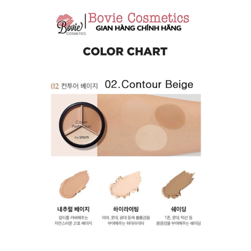 -Ba màu, được chia nhỏ theo các khuyết điểm da khác nhau, không chỉ che khuyết điểm mà còn tạo hiệu ứng tạo đường viền