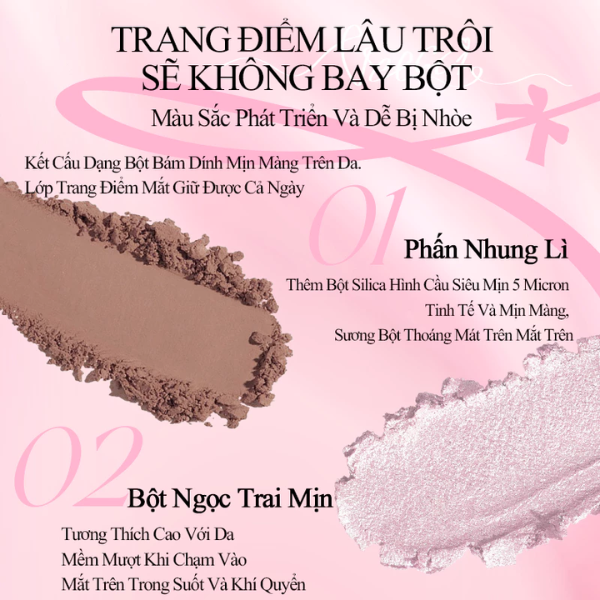 2. Kết Cấu Phấn Bám Mịn Vào Da. Bột Nhung Lì: Được Bổ Sung Thêm Bột Silicon Hình Cầu Siêu Mịn 5 Micron Cho Kết Cấu Tinh Tế Và Mịn Màng, Mang Lại Cho Mắt Trên Cảm Giác Phấn Mịn Như Sương Mù.Bột Ngọc Trai Tinh Tế: Bám Chặt Vào Da, Mềm Mượt Khi Chạm Vào, Tạo Cảm Giác Trong Suốt Trên Mắt