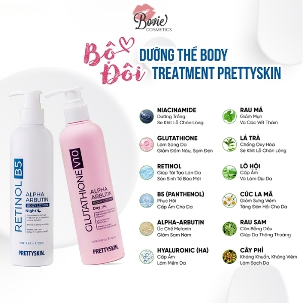 Kem Dưỡng Body Ban Ngày Và Ban Đêm Prettyskin Retinol B5 Alpha Arbutin Body Lotion & Glutathione V10 Alpha Arbutin Body Lotion