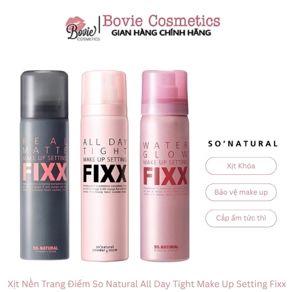 - Xịt khóa lớp trang điểm So Natural chứa những thành phần Silicone khả năng cố định lớp trang điểm hiệu quả, ngăn ngừa tình trạng lớp nền bị trôi, vón cục hay mốc phấn, không bị trôi hay phai màu, ngay cả trong những điều kiện thời tiết khắc nghiệt.